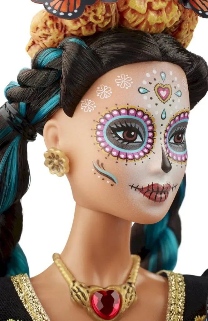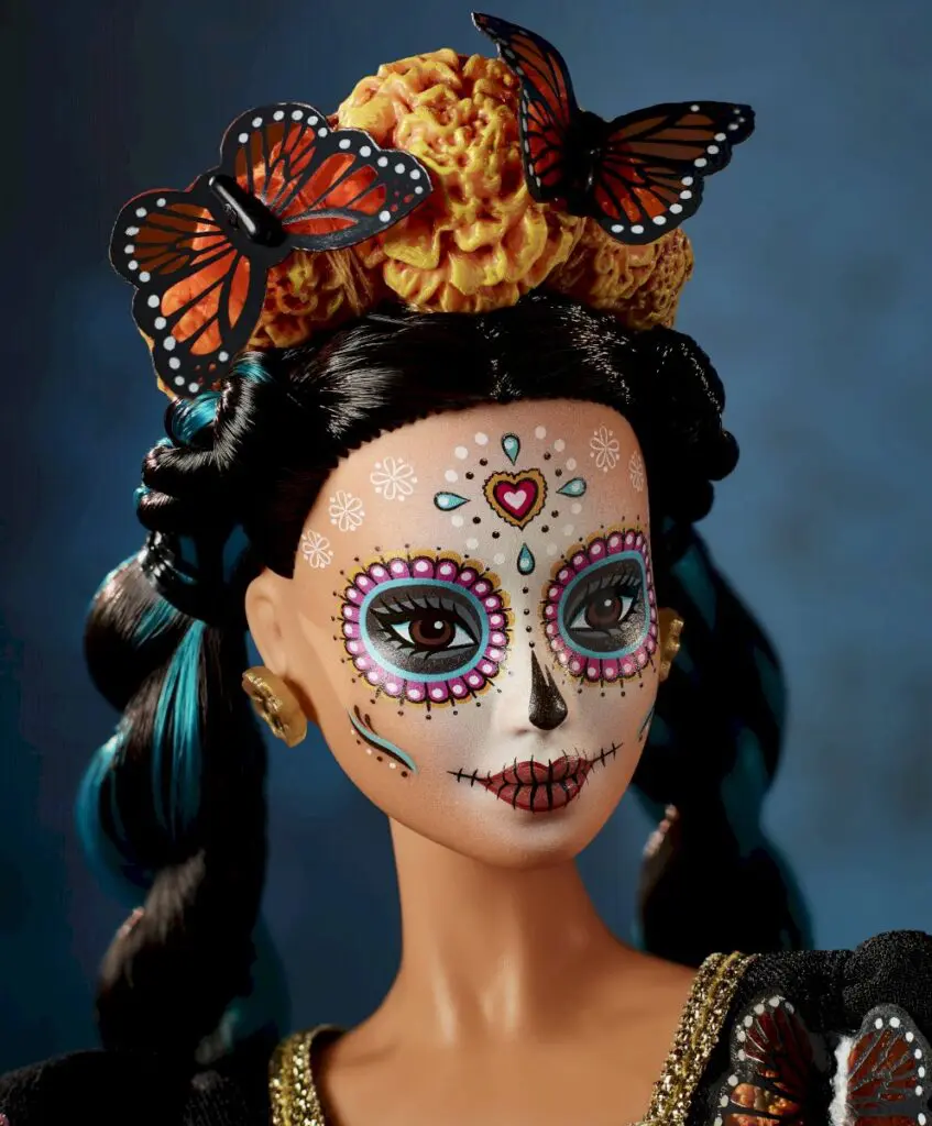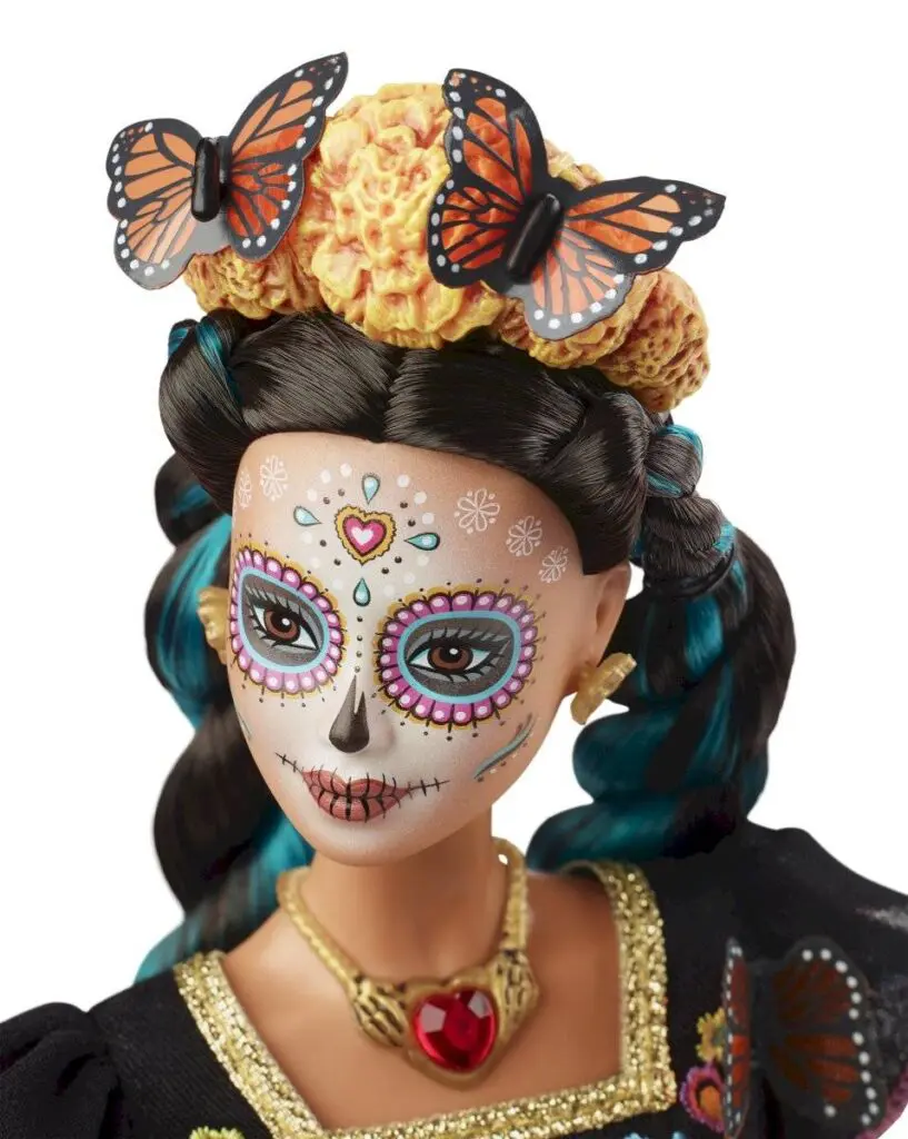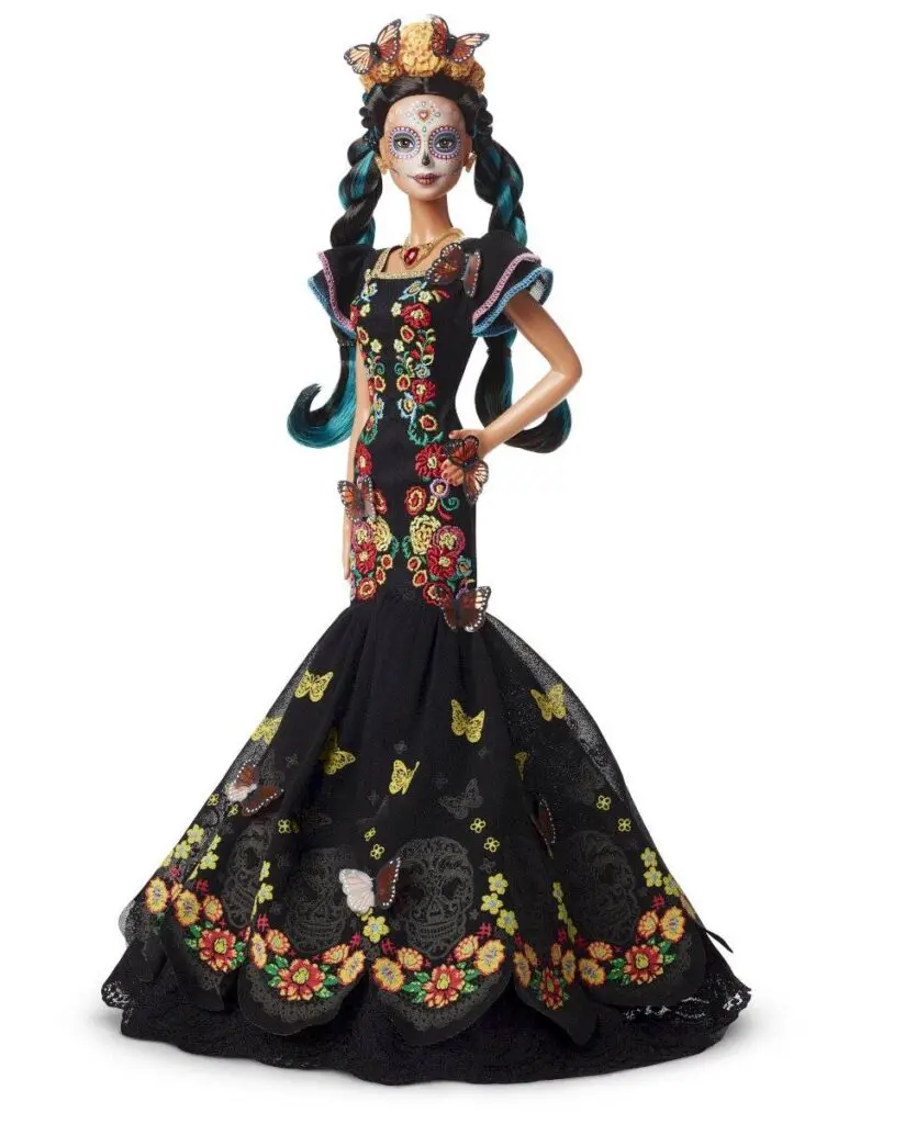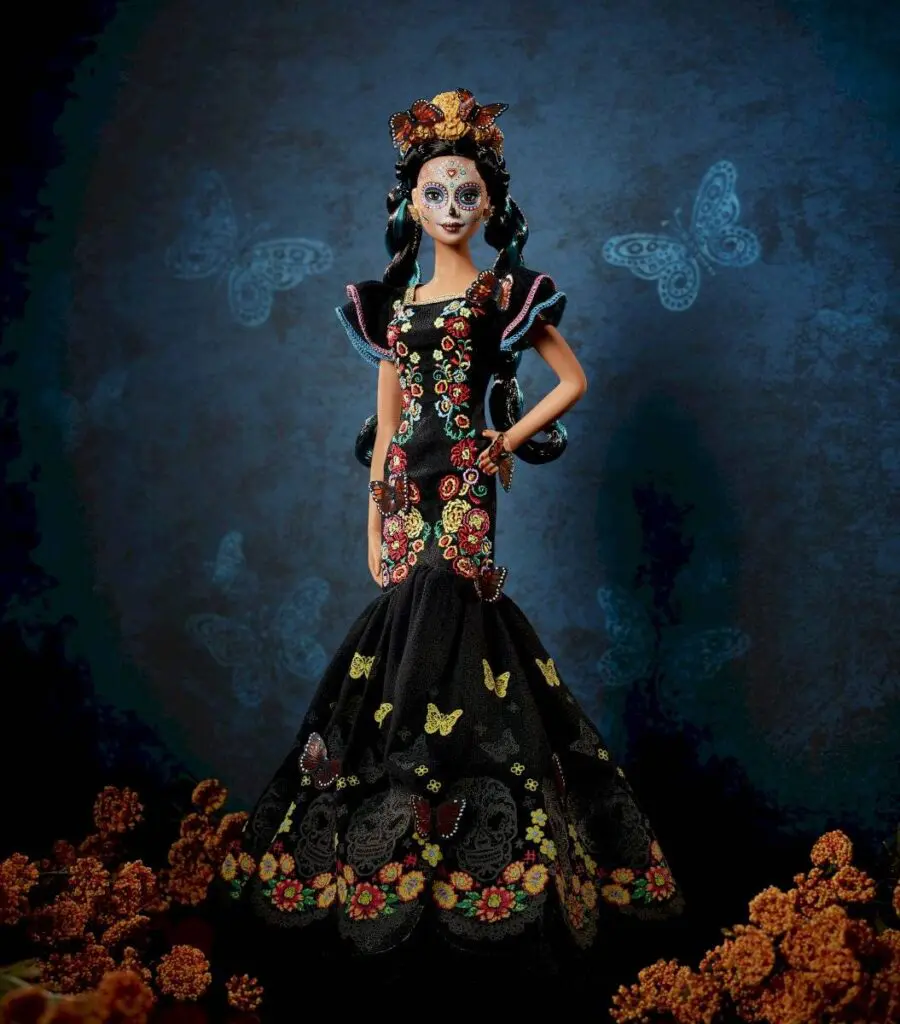 Barbie Día de Muertos está maquillada como la tradicional Catrina. Su vestido es largo, bordado y con volantes decorados de flores y mariposas. El toque final lo completa una corona con las icónicas mariposas Monarca y la flor de Cempasúchil, para honrar, por todo lo alto, a los símbolos y a las ofrendas de esta emblemática tradición mexicana.