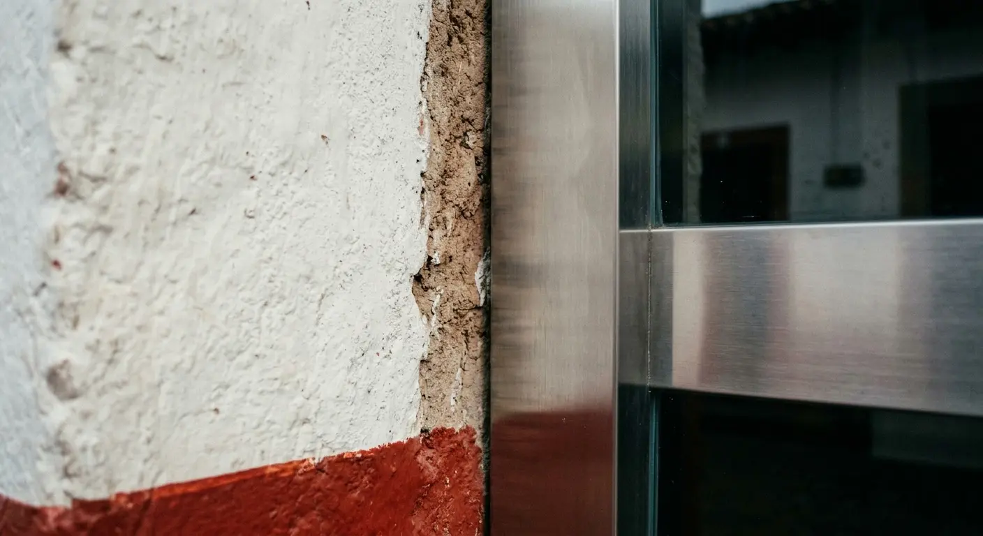 La cicatriz de la modernidad. Un detalle del choque entre el adobe centenario y el acero inoxidable de una nueva intervención comercial. No es solo un cambio de material; es la asfixia de lo orgánico por lo industrial. Una intervención que, una vez hecha, altera para siempre la pátina y el alma de la estructura original.
