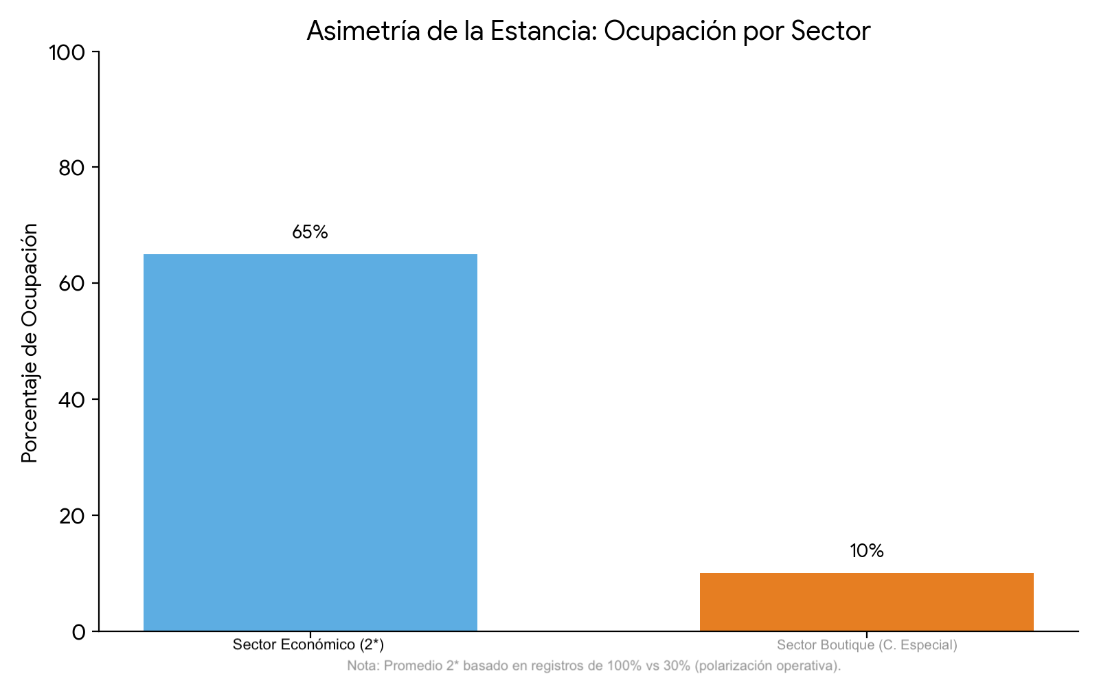 Radiografía de la fragmentación operativa en la Cuenca. El contraste entre un promedio del 65% en el sector económico —derivado de una polarización extrema del 100% frente al 30%— y la vacancia crítica en el segmento boutique (10%) desarticula la narrativa de un éxito homogéneo, revelando un ecosistema que se satura en volumen pero se debilita en sus eslabones de mayor valor e identidad.