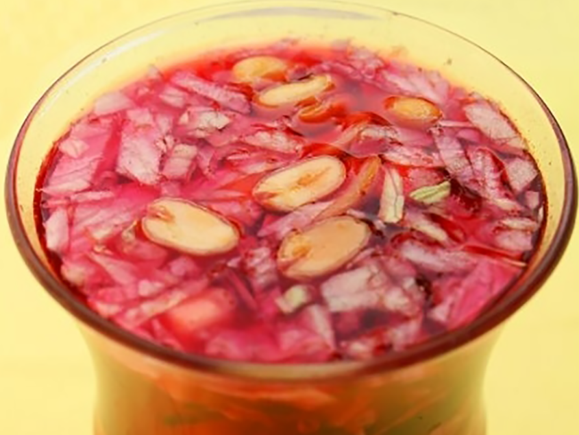 Hervir los betabeles y reservar el agua. Una vez cocidos, Cortar en cubos pequeños o rallar finamente, picar las demás frutas también en cubos pequeños.