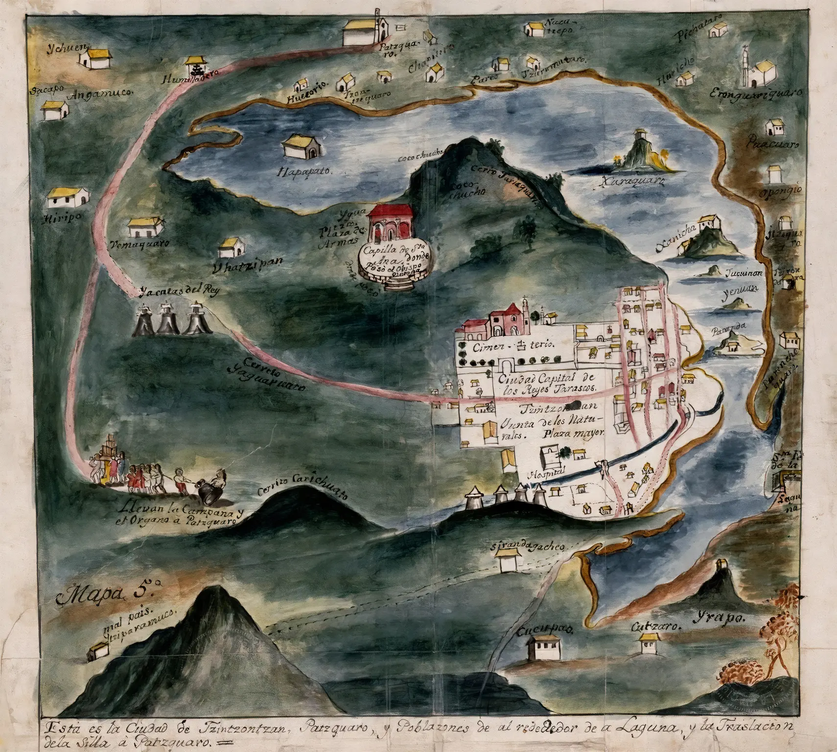 «Esta es la ciudad de Tzintzuntzan, Pátzcuaro y poblaciones de alrededor de la laguna y la traslación de la silla a Pátzcuaro»
